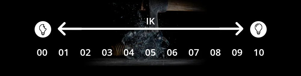 Il valore di protezione dagli urti (IK) indica la resistenza agli urti e la protezione da possibili atti vandalici. È espresso in combinazione con 2 cifre e va da IK00 a IK10. Gli articoli con IK00 non sono protetti dagli urti, mentre quelli con IK10 sono resistenti agli urti di 20 Joule e sono anche a prova di atti vandalici.